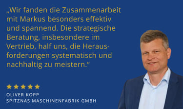 "Markus und sein Team sind Vollprofis für den Aufbau von Vertriebsorganisationen. Nach einem Workshop zu Recruiting, Onboarding und Führung konnte ich wirksame Hebel für Umsatz-wachstum implementieren. Was mich überzeugt hat: Ein Verkäufer, der unter Markus' Führung arbeitete, steigerte seine Provisionen in einem Ausmaß, wie ich es in 20 Jahren Vertriebserfahrung noch nicht erlebt habe."