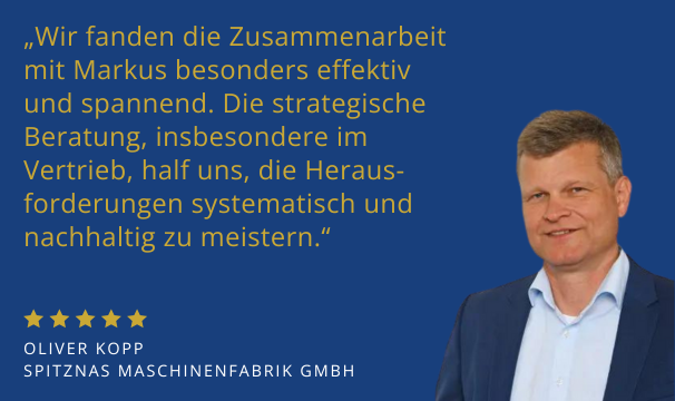 Durch die Einführung des neuen, systematisierten Verkaufsprozesses konnte die Spitznas Maschinenfabrik ihren Stellenwert im Markt signifikant steigern und im zweistelligen Bereich ausbauen. Diese Transformation hat nicht nur die Effizienz und Effektivität des Vertriebsteams verbessert, sondern auch dazu beigetragen, das Unternehmen als führenden Anbieter in seinem Spezialgebiet zu positionieren.